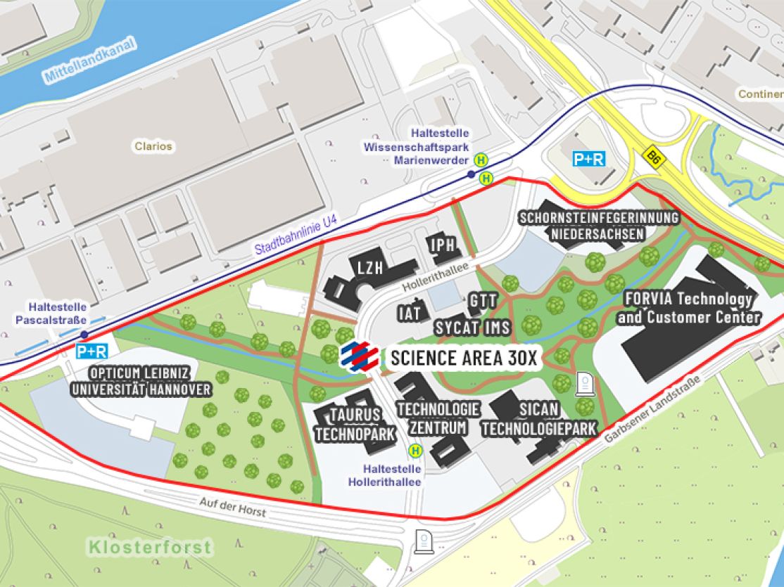 Als hochdynamischer Wirtschaftsstandort verbindet die SCIENCE AREA 30X (ehemals Wissenschafts- und Technologiepark Marienwerder) Wissenschaft mit Produktion, Spitzenforschung mit Start-ups und Ausbildung mit langjähriger Erfahrung. Umgeben von einem Landschaftspark, überzeugt das rund 28 Hektar große Gelände durch einen stimmigen Mix aus Produktivität und Natur. Dank der modernen Ausstattung auf höchstem technischen Niveau finden sich hier Orte zum motivierten, effektiven Arbeiten. Daneben bietet das parkähnliche Areal genügend Möglichkeiten zum Verweilen und Raum für kreative Pausen.