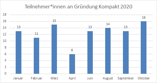 The four-week seminar is currently being held in a mixed format of online and face-to-face events. Only in April 2020 was the uncertainty caused by the pandemic reflected in a lower number of participants - since then, the willingness to set up a business has been impressively high and, at 71.9% of new start-ups* by participants, is far above the success rates of regular start-up advice, where the start-up rate is around 50%. Participation in Gründung kompakt thus prepares participants well for the market - and the prospect of a start-up grant from the Federal Employment Agency also increases the likelihood of implementation.