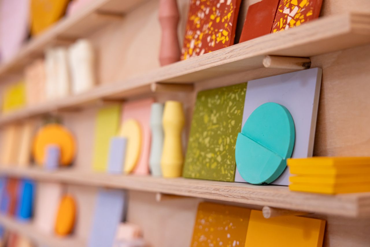 Farben und Oberflächen spielen eine wichtige Rolle bei der Aufenthaltsqualität in Räumen. Ich habe angefangen, mit einem Verbundwerkstoff auf Wasserbasis zu experimentieren. Das Material ist unglaublich vielseitig, lässt sich individuell einfärben und kommt ohne Brennofen aus. Funktional vergleichbar mit Gussbeton, zeichnet sich das Material aber durch eine bessere CO2-Bilanz und ein geringeres Gewicht aus. Damit kann ich unterschiedlichste Oberflächen und Muster entwickeln wie etwa Terrazzo, Reliefs, Strukturen oder monochrome Flächen. Es lassen sich außerdem Holzspäne, Steine oder andere Effektzuschläge beimischen. So entstehen ganz nach Wunsch individuelle Flächen für Wände, Möbel und andere Gegenstände, die die Raumwirkung maßgeblich beeinflussen. Die Gestaltung kann eigenwillig, lustig, gewagt oder auch zurückhaltend, edel und ruhig sein, um nur einige Möglichkeiten zu nennen.