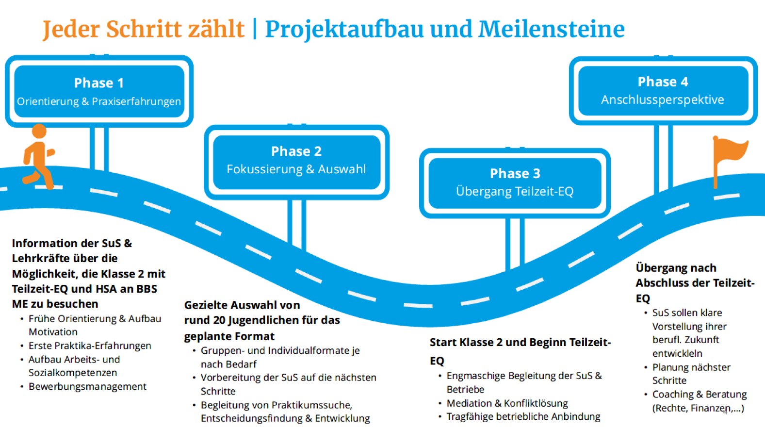 Mindestens 20 benachteiligten Jugendlichen aus dem Jahrgang 2025/26 der Berufseinstiegsklassen (BES) der BBS me, 2, 3 und 7 Hannover sollen durch gezielte Vermittlung in eine Teilzeit-EQ eine realistische und berufliche Anschlussoption ermöglicht werden.