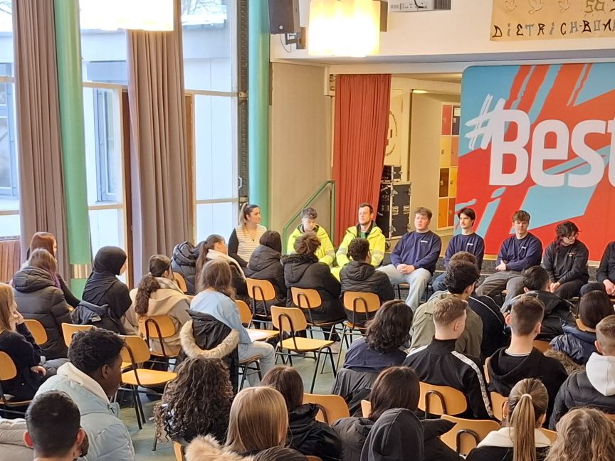 Unter dem Motto „let’s talk live!“ besuchen wir seit 2024 mit unseren Azubi Talks Schulen in der Region Hannover. Schüler*innen kommen dabei direkt mit Auszubildenden aus verschiedenen Branchen ins Gespräch, erhalten authentische Einblicke in den Ausbildungsalltag und erleben Berufsorientierung aus erster Hand.
