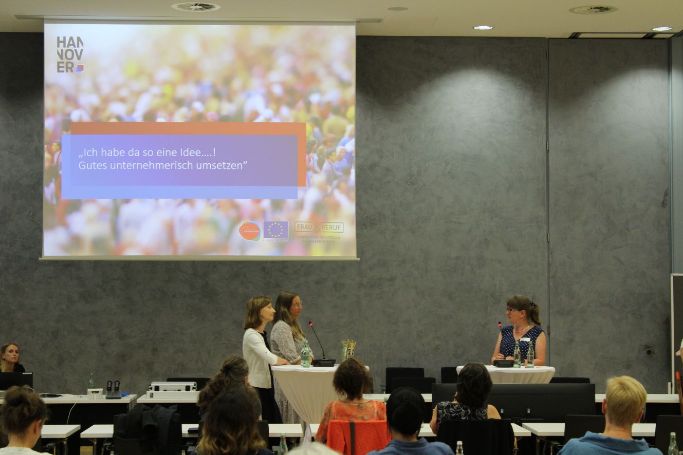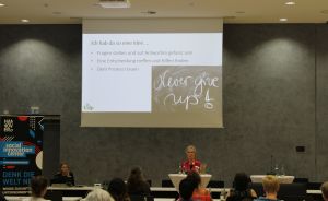 Alle drei erzählten eindrücklich von ihren Gründungsgeschichten und gaben den Anwesenden einen authentischen Einblick in die schönen sowie anstrengenden Momente, die sie erlebt hatten. Was sie ebenfalls gemeinsam hatten, war die Unterstützung durch GründerinnenConsult und dem Social Innovation Center. Während ihrer Vorträge und der anschließenden Podiumsdiskussion erzählten Claudia, Claudia und Rita von der Beratung, die sie bekommen hatten und den einzelnen „Modulen“ die sie während ihres Gründungsprozesses in Anspruch nahmen. Alle drei haben sich sehr gut unterstützt gefühlt und den interessierten Frauen vor allem eins ans Herz gelegt: man muss es nicht alleine schaffen! Nutzt die tollen Angebote, die es gibt!