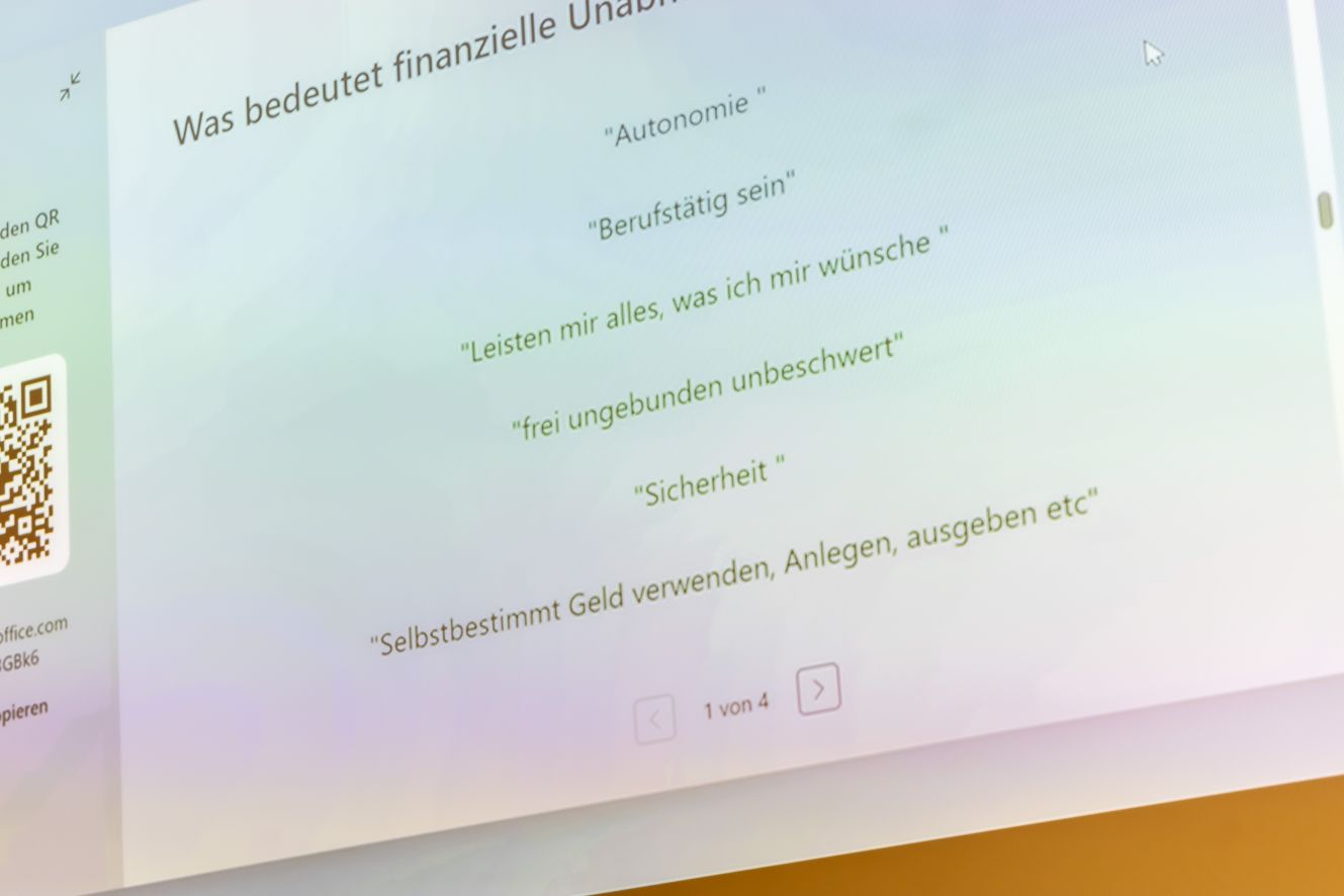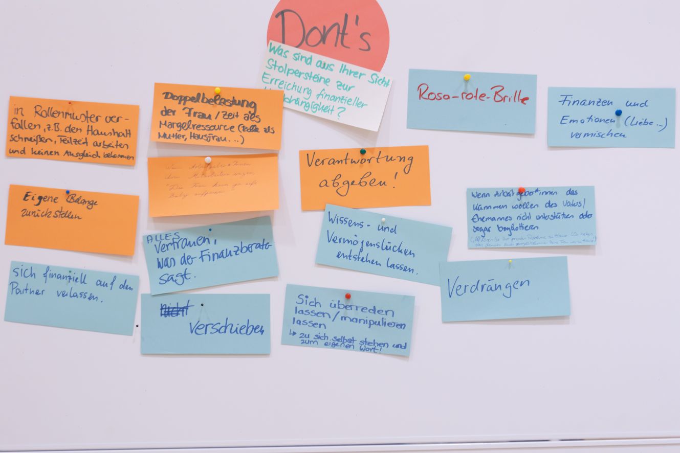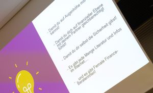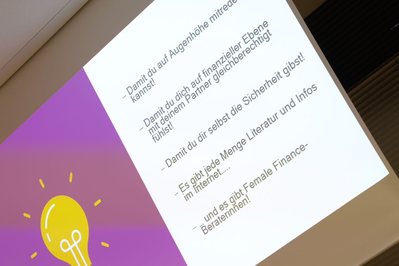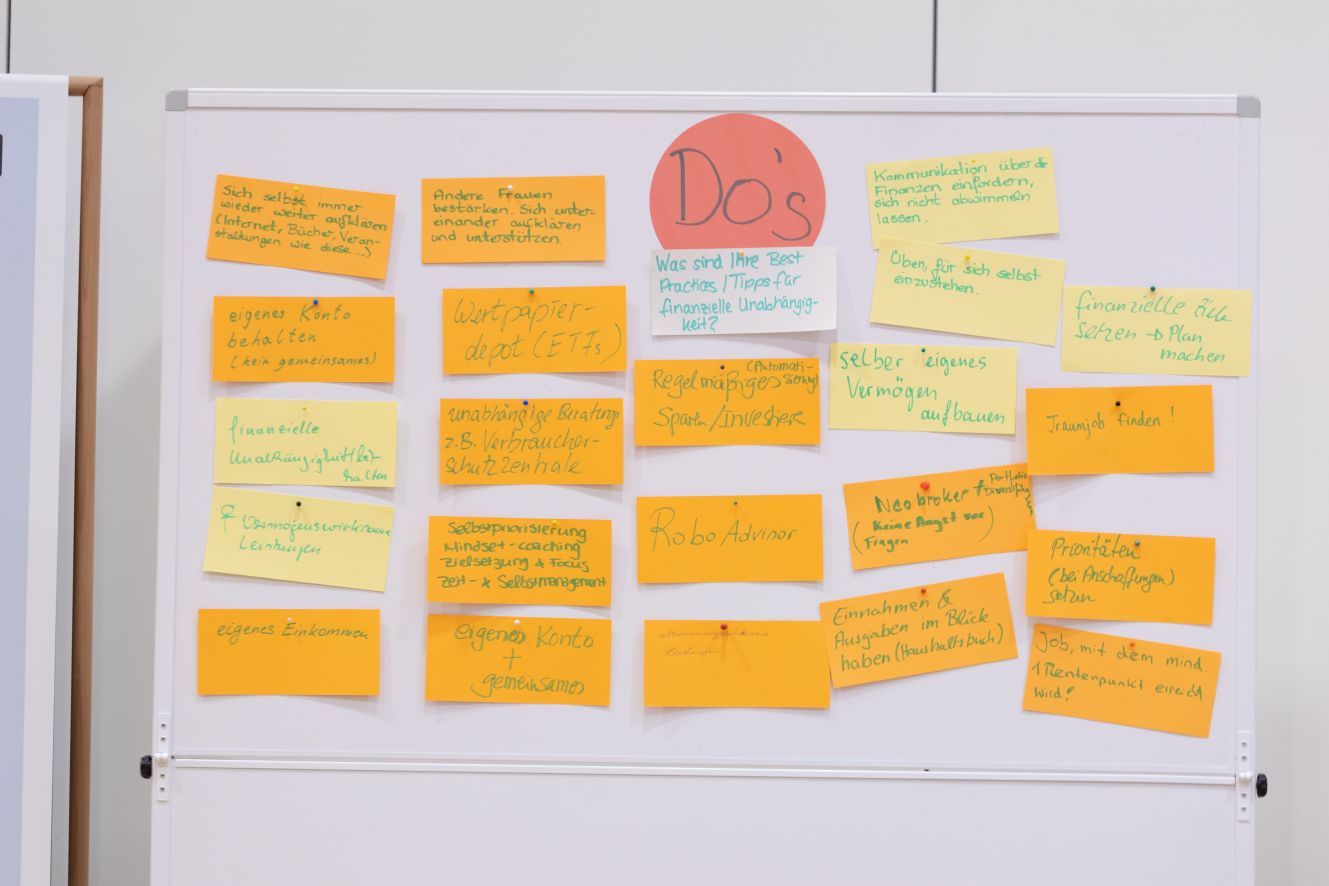 Doch ob mit oder auch ohne Partner*in – die eigenen Finanzen sollte jede*r für sich im Blick haben. Das Vorgehen ist für Frau Raddatz-Breden keine Zauberwerk: Sich über die eigenen Einnahmen und Ausgaben einen detaillierten Überblick verschaffen, sich vor Augen führen, was für Wünsche und Ziele man hat (eine Immobilie, eine tolle Weiterbildung oder doch Frührente und Wohnmobil?), die eigene mögliche Rentenlücke kennen, sich über Geldanlagen und Investitionsmöglichkeiten informieren und dann: Mutig sein, ins Handeln kommen und Dinge in die Tat umsetzen!