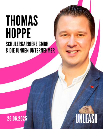 Thomas Hoppe ist seit 2023 Bundesvorsitzender des Verbandes DIE JUNGEN UNTERNEHMER. Hartnäckigkeit, Tatendrang, Durchhaltevermögen und Willensstärke sind für Hoppe wichtige Tugenden. Das passt auch zu seiner Vita, denn er hat inzwischen viele Hüte auf: Thomas Hoppe ist Geschäftsführer und Gründer der Schülerkarriere GmbH, eines der bundesweit größten Karriere-Netzwerke für Schüler*innen. Zudem gründete Thomas Hoppe die Office-Sharing Firma work connect GmbH und besitzt eine Beratungs- und Beteiligungsgesellschaft für Startups, die InvConNet GmbH.