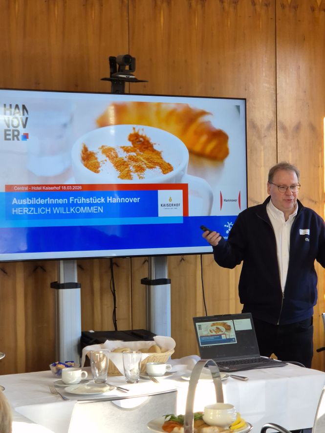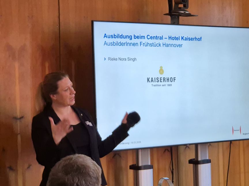 Beim Ausbildungsfrühstück 2026 begrüßten Bernd Lixfeld von der Wirtschaftsförderung der Landeshauptstadt Hannover und Gastgeberin Rieke Nora Singh vom Hotel Kaiserhof zahlreiche Ausbilder*innen und Personalverantwortliche.