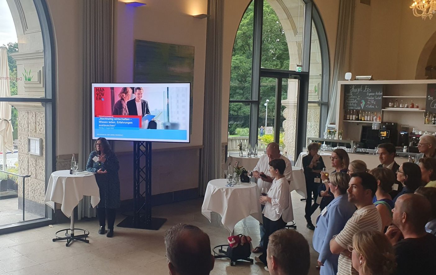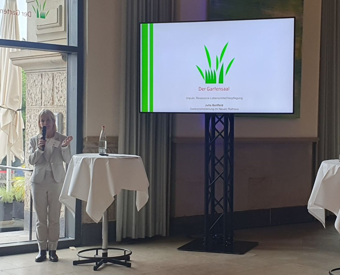 Ebenfalls zum Netzwerken trug der dritte und letzte Impuls von Julia Bortfeld, Gastronomieleitung im Neuen Rathaus, bei, die nicht nur gemeinsam mit ihrem Team für die Verpflegung am Abend verantwortlich war, sondern auch einen spannenden Einblick in ihr Tätigkeitsfeld gab. Frau Bortfeld leitet das Restaurant „Der Gartensaal“ sowie die Kantine des Neuen Rathauses, was gastronomisch nicht unterschiedlicher sein könnte. Sie nahm die Gäste dabei mit auf ihrem Weg, regionales und ökologisches Essen in den Speiseplan zu integrieren und durch verschiedene Aktionen immer wieder kleine Anreize zu schaffen, sich für das vegetarische/vegane Gericht zu entscheiden.